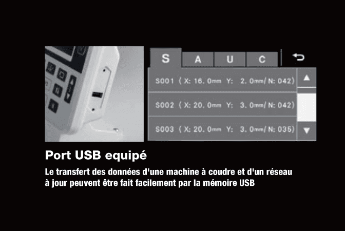 Équipé de l’écran couleur LCD avec un écran tactile qui indique les éléments à afficher avec des icônes d’illustration, offrant une utilisation intuitive. Il est très facile de définir le programme de cycle, ainsi que les patrons de couture, la vitesse de couture . La tension du fil supérieur peut être facilement enregistrée en tant que programmes utilisateur.