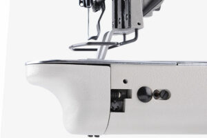 Le système d’entraînement double (pied d’entraînement inférieur et pied-de-biche supérieur) assure un entraînement parfait des deux couches de tissu. La machine est dotée d’un panneau de commande intuitif intégré à la tête et d’un rétroéclairage LED à intensité réglable près de la barre à aiguille.
