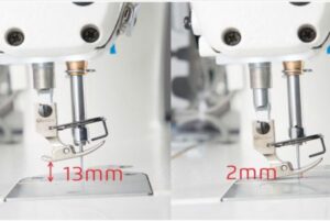 La hauteur du pied-de-biche peut être réglée dans une plage de 0 à 13 mm, ce qui permet de répondre aux exigences des tissus de différentes épaisseurs et d’économiser du temps.